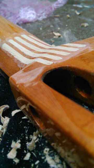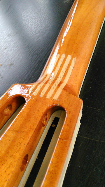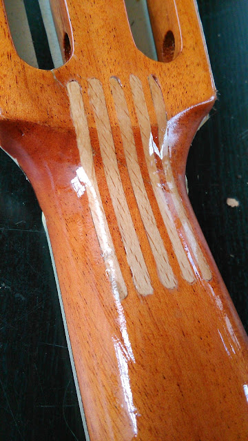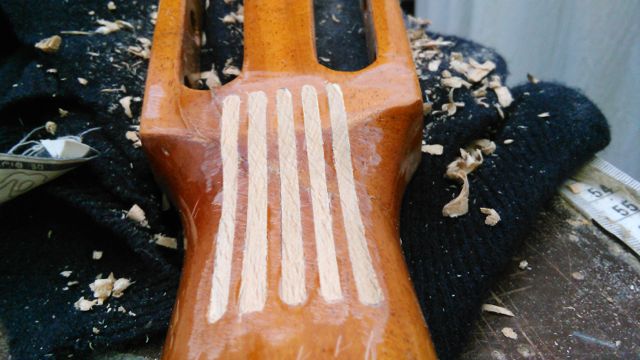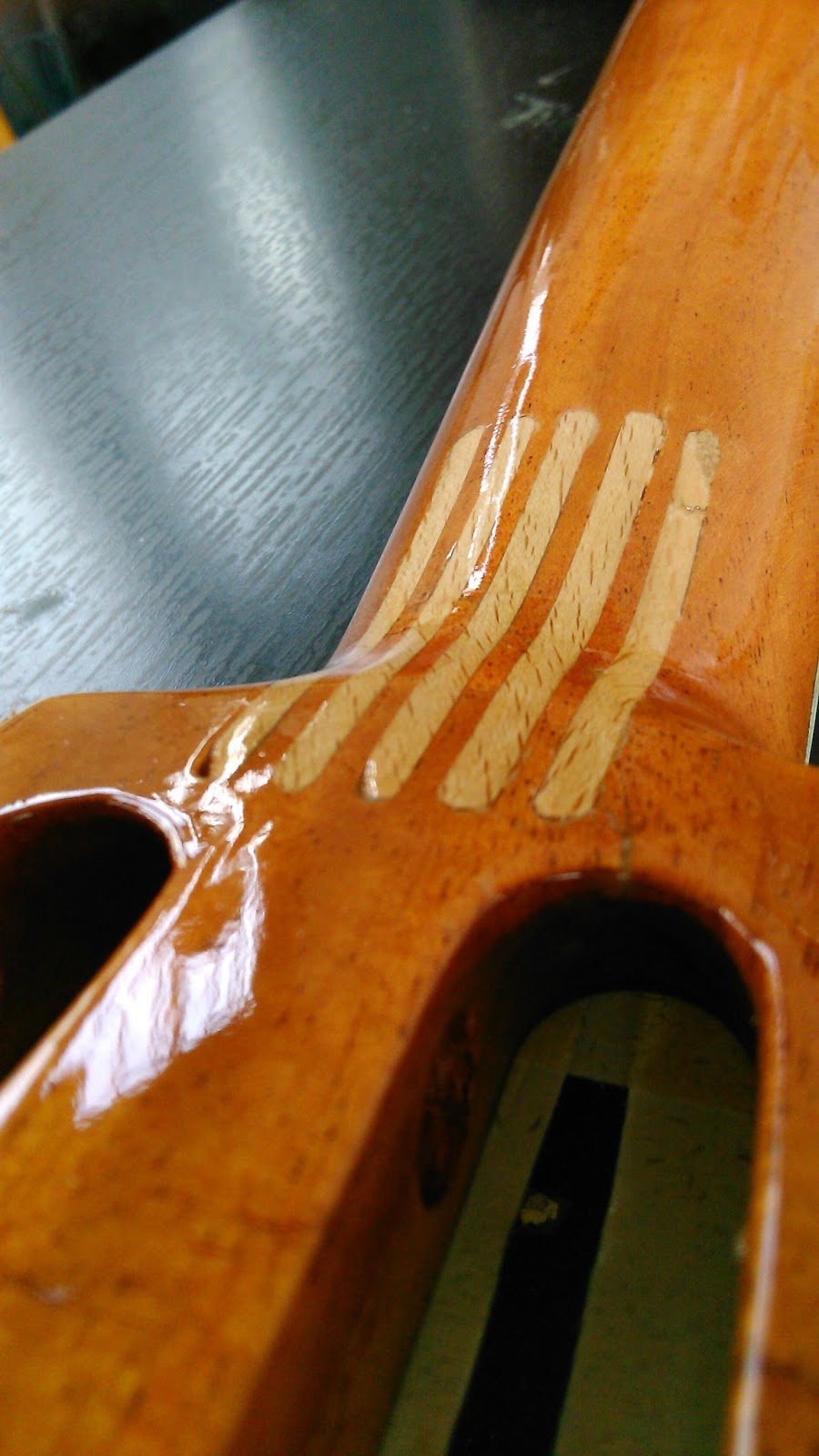De verf droogt nu. Dan nog een topkam maken en er nieuwe snaren op zetten en waarschijnlijk is het geheel dan weer in goede staat.