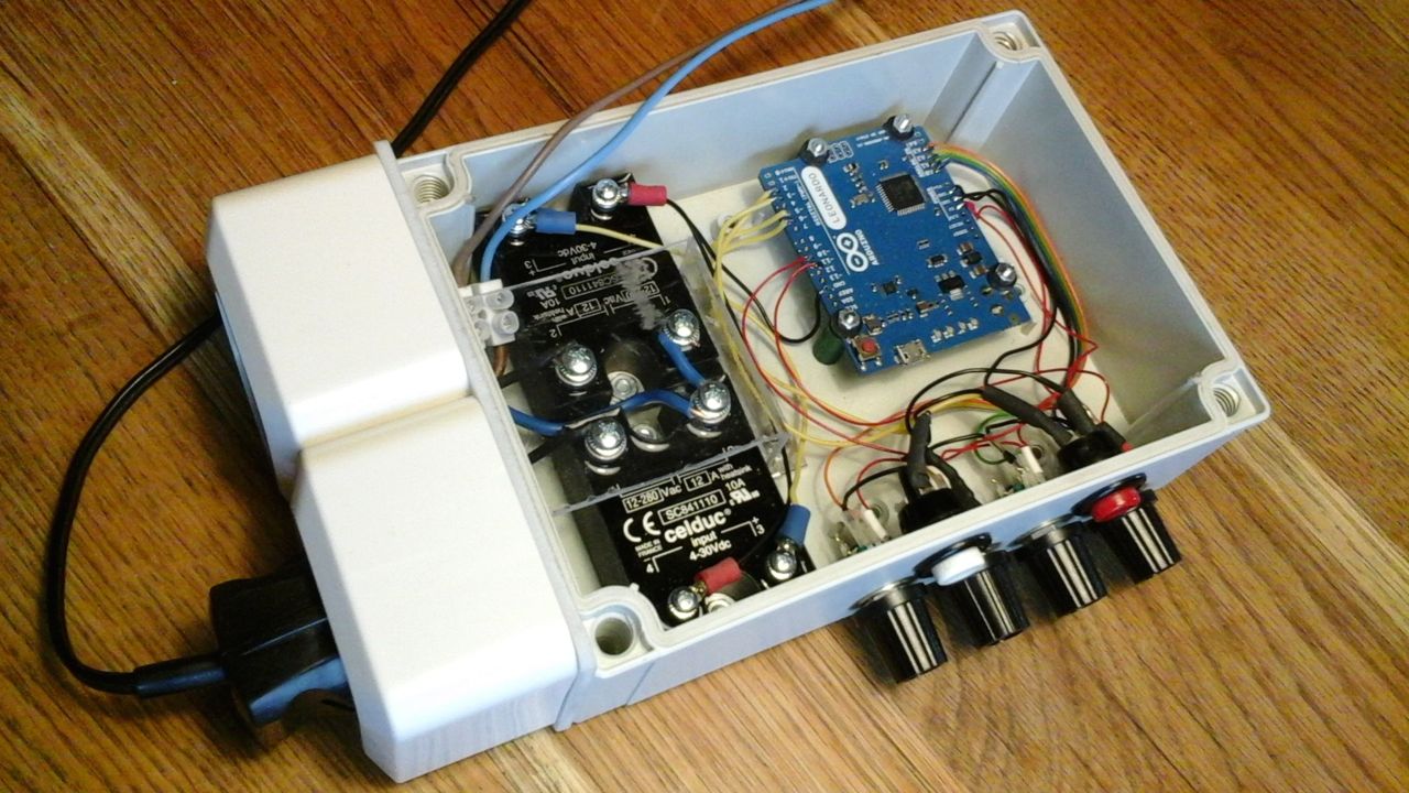 Een Arduino en 2 solid state relais met 2 220v contactdozen.